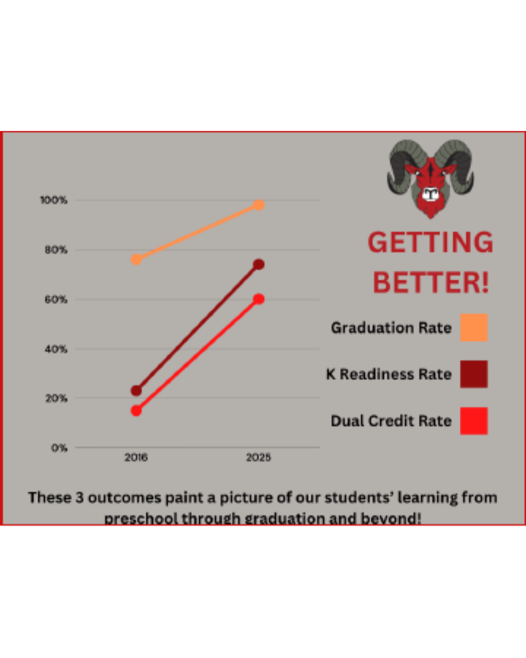 As a result of our positive TEAM culture, we are seeing positive student learning outcomes! To your right, you will see significant improvement from 2016-2025 in the following metrics (just to name three):